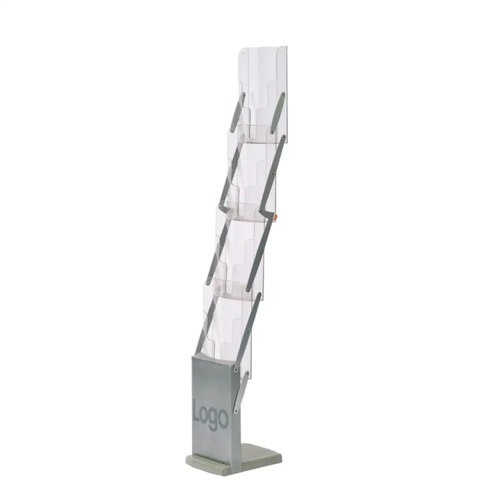 Exclusive and portable brochure stand in stable construction. Made of powder-coated steel, aluminum and durable plastic in the brochure compartment. A sturdy bag is included to easily move the brochure stand. Can be folded with brochures left in the compartments. Space for 4 x A4. Can also be fitted with a logo on the foot.