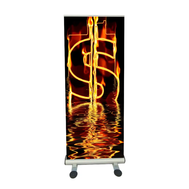 Made for outdoor use with a heavy and stable foot. The RollUp function is built into the foot. Adjustable bar included, which means that you have 3 pcs. options in height, 90 cm, 145 cm and 205 cm. A built-in suspension construction means that the product can withstand wind. A good alternative to ordinary street stands at events.