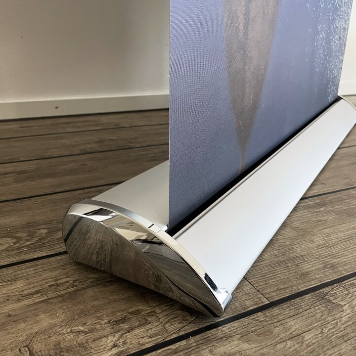 Exclusive roll up in natural anodized aluminum with extra wide designed foot with chrome sides.