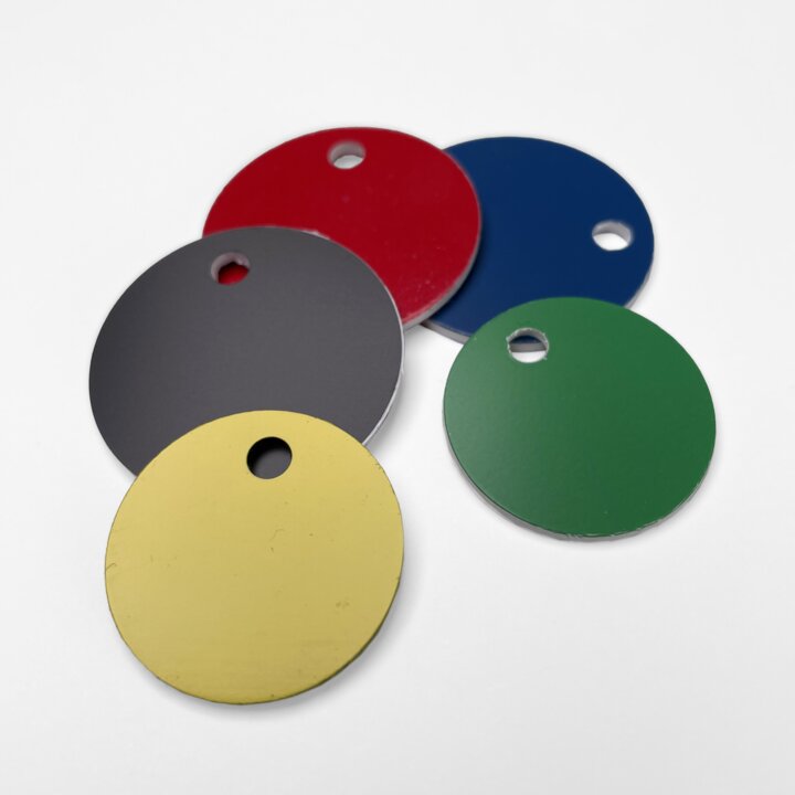 Round badges of plastic laminate 3 layers.