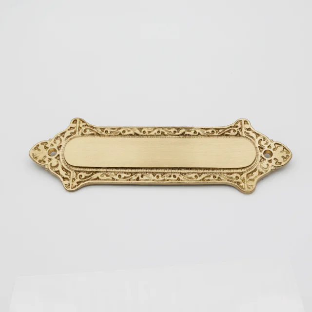 Brass door sign with decorative edges and unique shape. Available in matt gold and black lacquered finish. Size 200x62 mm.