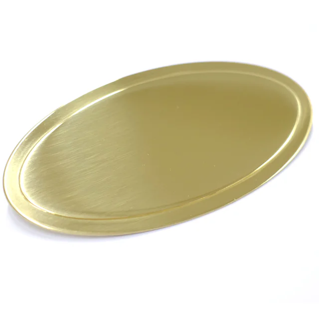 Oval lacquered brass sign with a nice shiny surface. Perfectly suited for processing in YAG/Fiberlaser, UV printing and rotary engraving. Size 145x73mm. Without holes.