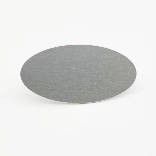 Oval name tag of 1.0 mm matt natural anodised aluminum in size 32x63mm. Intended for marking with rotary engraving. Gives white text when marking in CO2 laser engraving.