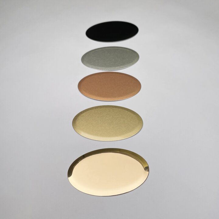 Oval nameplates with arched edge of Alumamark aluminium. Specially made for Co2 laser engraving. Gives black text without any pre-treatment of the material.