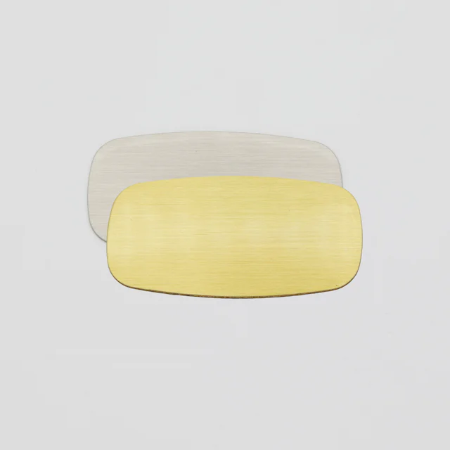 Arched "TV badge" nameplate in lacquered brass. For rotary engraving. Available in gold & silver. Size 32x63 mm.