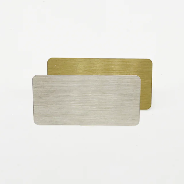 Rectangular nameplate with rounded corners, made in lacquered brass, nickel-plated brass and nickel sheet. For rotary engraving.